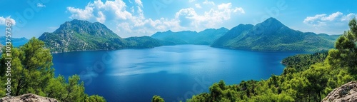 Breathtaking panoramic view of a serene lake surrounded by majestic mountains and vibrant blue sky, perfect for nature lovers.