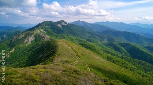 Breathtaking panoramic view of green mountains and valleys under a bright sky filled with clouds : Generative AI