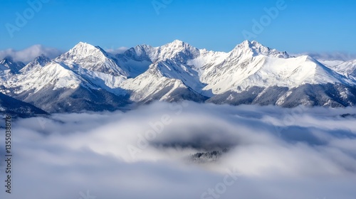 Breathtaking snowcovered mountain peaks towering above the clouds on a clear sunny day showcasing nature's beauty : Generative AI