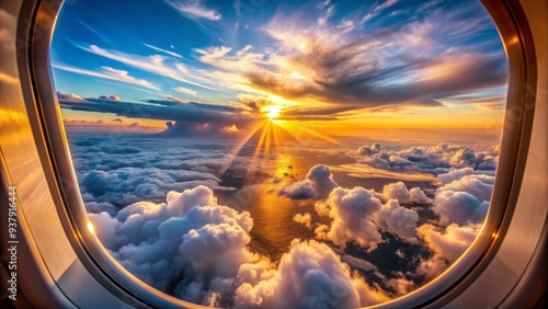 Breathtaking sunrise skyline overlooks fluffy white clouds and endless ocean waters, seen from an airliner's windows, capturing the serene beauty of flight.