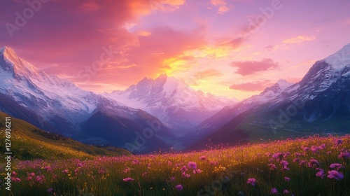 Breathtaking sunset over mountain range with vibrant wildflower meadow and snow-capped peaks