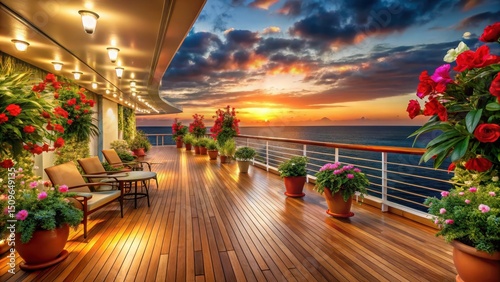 Breathtaking Tropical Oasis on Cruise Ship Deck, tropical flowers, warm lighting