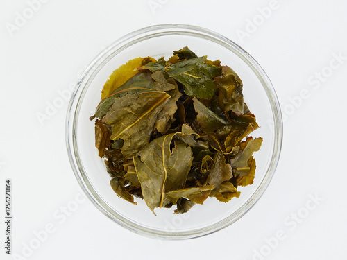 brewed Chinese tea leaves in a transparent cup, photo on a white background