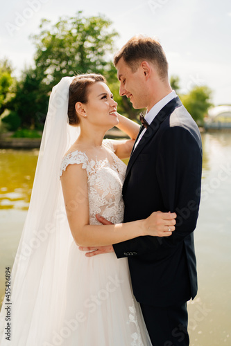 bride and groom dance by the water. beautiful and happy wedding in open air.