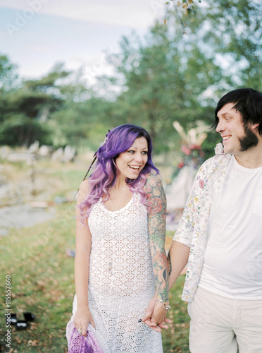 couple, bride, groom, man, woman, mid, adult, caucasian, hipster, wedding, hand, hold, walk, smile, happiness, togetherness, love, bond, lifestyle, celebration, ceremony, casual attire, long hair, tattoo, front, 2, people, outdoors, day, sweden