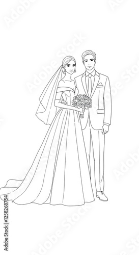 wedding, couple, bride, groom, line art, illustration, minimal, outline, dress, tuxedo, bouquet, romance, marriage, love, ceremony, elegant, artistic, monochrome, fashion, classic