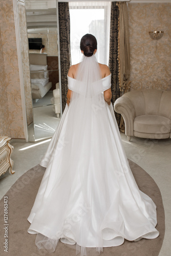 bride in a wedding dress standing with her back to the camera. The dress is white with a long veil that hangs from her head.