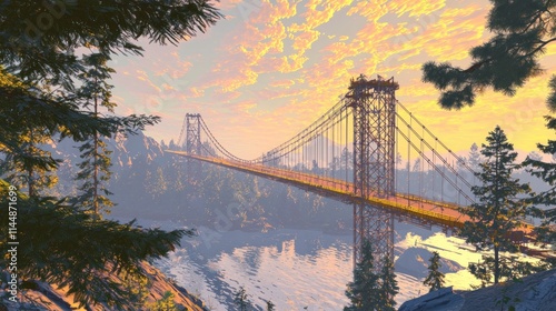 bridge, sunset, mountain, landscape, tree, sky, nature, travel, outdoors, scenic, view, dawn, morning, calm, peaceful, tranquil, beauty, light, gold, cloud, river, water, wilderness, panorama, path, perspective, horizon, structure, architecture, forest, pine, summer, vacation, sunlight, destination, journey, adventure, explore, environment, aethereal, inspiring, idylli, majestic, serene, picturesque, remote, isolated, gradient