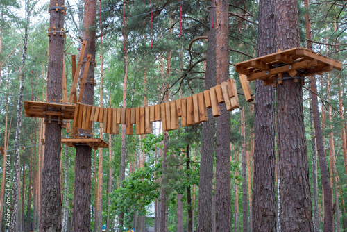 Bridge made of logs tied to ropes, part of the rope course. Rope park in the forest. A route for training courage, balance, agility,