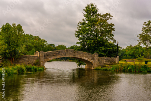 outdoors, bridge, water, archway, greengrass, horizontal, lake, park, park bench