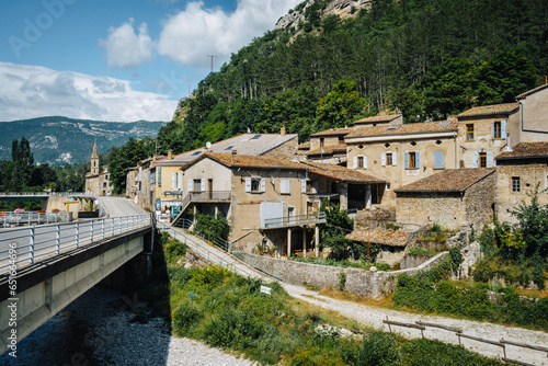 Bridge over the Drome river and houses of the small medieval village of Pontaix, in the south of France (Drome)