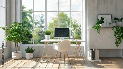 Bright and airy home office with plants, a desk, and a computer, designed for productivity and inspiration.