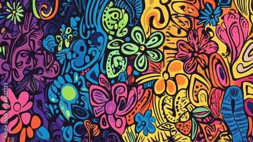 Bright and colorful abstract doodle shapes filled with flowers and patterns create cheerful and inviting atmosphere. This vibrant artwork showcases mix of playful designs