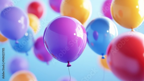Bright and colorful balloons floating in the air, set against a clean party-themed background, 3D rendered.