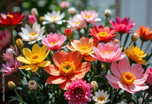 Bright and colorful bouquet of blooming flowers with pink, yellow, orange, and white petals
