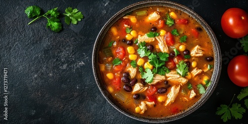 Bright and colorful chicken soup with corn, beans, and fresh herbs in a bowl on a rustic surface