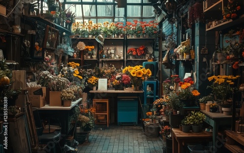 Bright and colorful flower shop filled with various blossoms and plants in a cozy urban setting during daylight hours