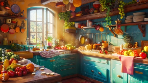 Bright and Colorful Kitchen with Fresh Fruits and Vegetables on the Counter