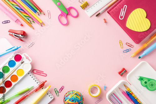 accessory, art, back, background, brainstorm, brush, classroom, clip, colourful, colouring, craft, creativity, decor, desk, doodle, education, flat, hobby, children, lay, learn, learning, marker, notebook, notebook, office, organisation, paint, paper clip, pastel, pen, pink, planning, ruler, school, scissors, sharpener, stationery, student, study, supply, teaching, tool, top, view, workspace