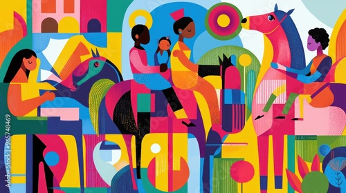 woman, illustration, people, man, children, horse, abstract, environment, geometric, shape, bright, colourful, interact, figure, variety, vibrant, art, design, modern, creative, playful, composition, high-coloured, dynamic, unique, imaginative, surreal, whimsical, fantasy, character, diversity, lively, expression, surrealism, contemporary, joyful, bold, conceptual, artistic, form, movement