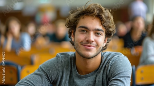 Bright and determined young man, showcasing intelligence and readiness, seated in a university classroom setting