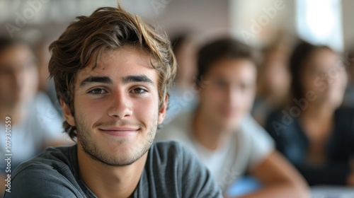 Bright and determined young man, showcasing intelligence and readiness, seated in a university classroom setting