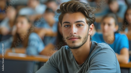 Bright and determined young man, showcasing intelligence and readiness, seated in a university classroom setting