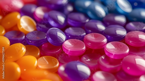 Bright and glossy plastic pellets in various hues, their smooth surfaces captured in a close-up view that highlights the intricate details and vibrant colors under soft light.