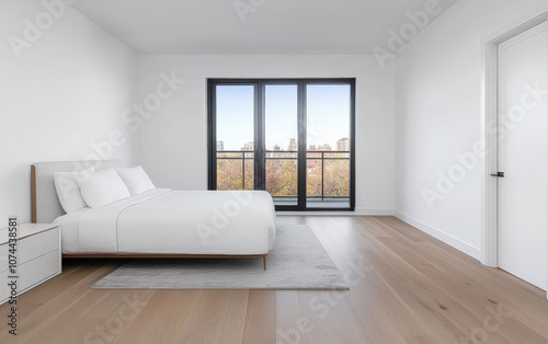 bedchamber, minimalist, modern, decor, city, skyline, large, window, natural, light, roomy, bright, white, wall, wood, flooring, stylish, furniture, contemporary, design, cosy, serene, clean, indoor, home, scenic, view, hardwood, calmness, comfort, residential, space, interior, aesthetic, relaxation, area, urban, landscape, peaceful, neutral, tone, inviting, element, layout, simple, elegance, daylight