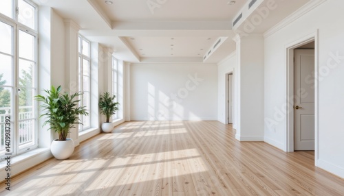 Bright and spacious open room design modern office interior photography minimalist environment wide angle view contemporary concept