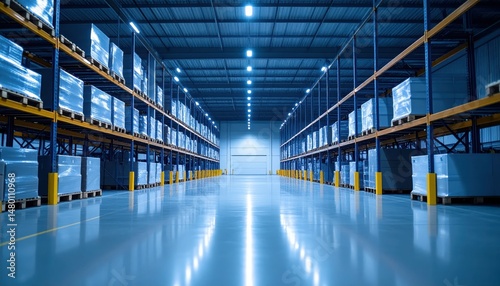 warehouse, aisle, pallet, storage, industrial, lighting, shelf, inventory, logistic, organisation, clean, roomy, facility, distribution, transportation, supply, empty, product, good, architecture, metal, flooring, environment, workplace, modern, business, operation, management, security, blue, white, design, technology, infrastructure, equipment, loading, unloading, efficiency, planning, interior, space, shelving, material, stock, factory, item, arrangement, commerce