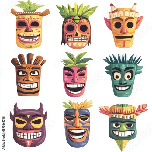 tiki, mask, tribal, colourful, illustration, set, collection, face, art, culture, pattern, festival, cartoon, tradition, ornament, design, native, expression, bold, feather, style, decor, character, ethnic, costume, symbol, graphic, mythical, vibrant, exotic, heritage, ceremonial, spiritual, masking, painted, carved, smile, wood, abstract, vector, creative