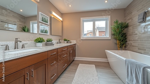 Bright bathroom double vanity, tub, large mirror, stone tiles, and potted plant decor