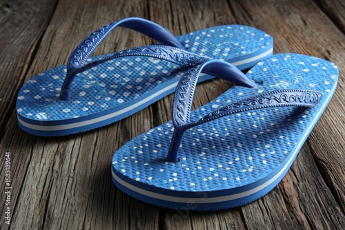 Bright blue flip flops resting on a rustic wooden surface with a textured design in the background