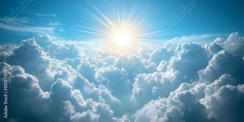 Bright blue sky filled with fluffy clouds captures golden sunlight rays, creating an ethereal atmosphere and a celestial landscape perfect for panoramic, inspirational photography.