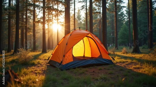 Bright camping tent set up in a forest, surrounded by tall trees, warm sunlight streaming in, nature escape.