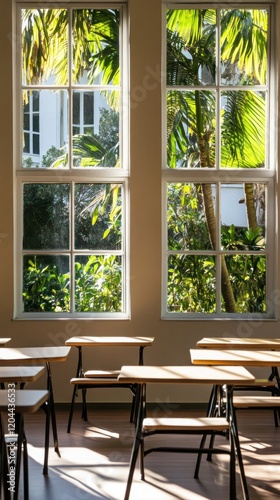 classroom, desk, window, greenery, sunlight, learning, education, nature, interior, space, design, plant, atmosphere, study, environment, calmness, architecture, decor, light, shadow, peaceful, organisation, furniture, wood, metal, modern, simplicity, view, tropical, vibrant, open, airy, structure, creativity, inspiration, growth, sharpened, community, engagement, interaction, resource, aesthetic, comfort, motivation, clarity, arrangement, layout, worked