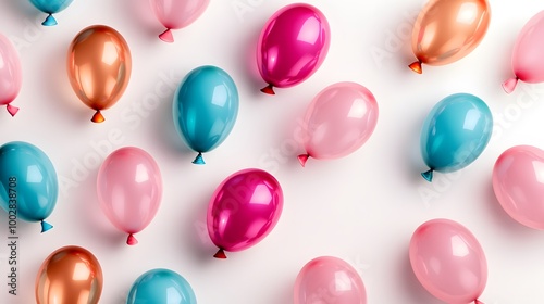 Bright, colorful balloons with soft shadows on a clean white surface.
