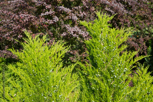Bright colorful picture of Rose Glow barberry and Juniper growing in park. Green and purple nature background.