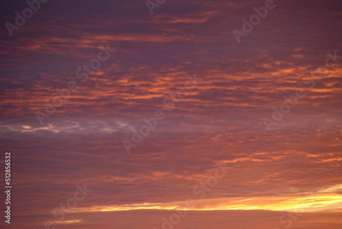 Bright colorful sunset sky with vivid smooth clouds illuminated with setting sun light spreading to horizon