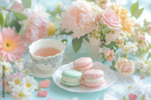Bright composition of pastel macarons with floral arrangements in a cozy setting during afternoon tea