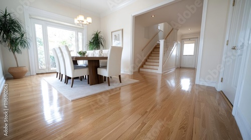 dining, room, hardwood, floor, stair, hall, bright, house, home, interior, design, real estate, architecture, luxury, elegant, roomy, modern, white, wood, furniture, table, chair, light, clean, contemporary, decor, style, living, residential, property, comfortable, beautiful, sophisticated, warm, welcoming, sunny, polished, family