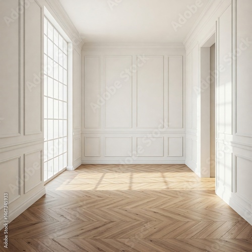 Bright Empty Hallway with Elegant White Wall Paneling and Herringbone Wood Flooring Illuminated by Natural Light