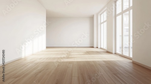 Bright, empty interior of a modern room with wooden flooring and sunlight streaming through large windows