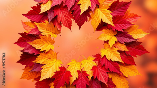 Bright fall leaves in circle shape on warm orange background with copyable.