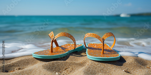 Bright flip-flops rest on sandy shores, hinting at leisurely beach days
