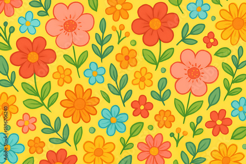 flower, pattern, seamless, floral, vector, design, wallpaper, nature, illustration, decoration, flower, summer, art, spring, leaf, texture, textile, plant, ornament, fabric, decor, yellow, retro, garden, orange