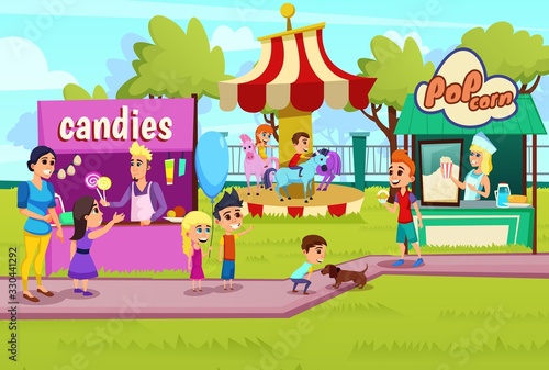 Bright Flyer Inscription Pop Corn and Candies. Rides and all Other Entertainments Huge Amusement Park. Children Play in Park, Ride on Carousels and Buy Sweets. Vector Illustration.