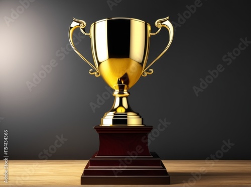 Bright golden trophy stands on a wooden surface against a dark background, symbolizing achievement and success
