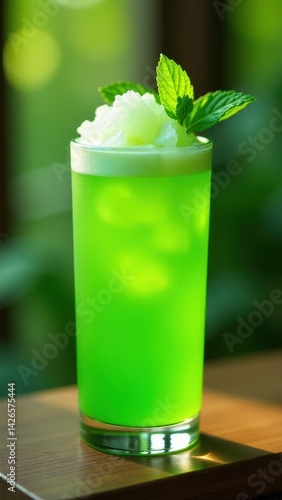 Bright green cocktail topped with crushed ice and fresh mint leaves, served in a tall glass — a vibrant, refreshing summer drink perfect for hot days.